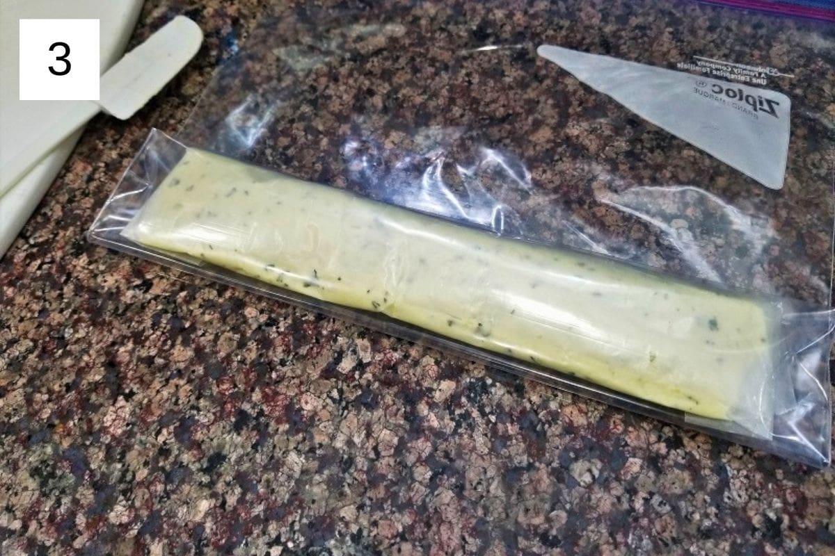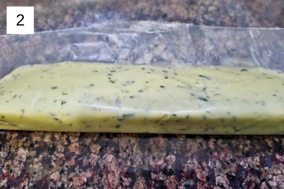 Step 4) Use immediately, or if freezing, spoon the compounded butter onto a piece of wax paper or plastic wrap (image 2), forming all of it into a log and wrapping it well.